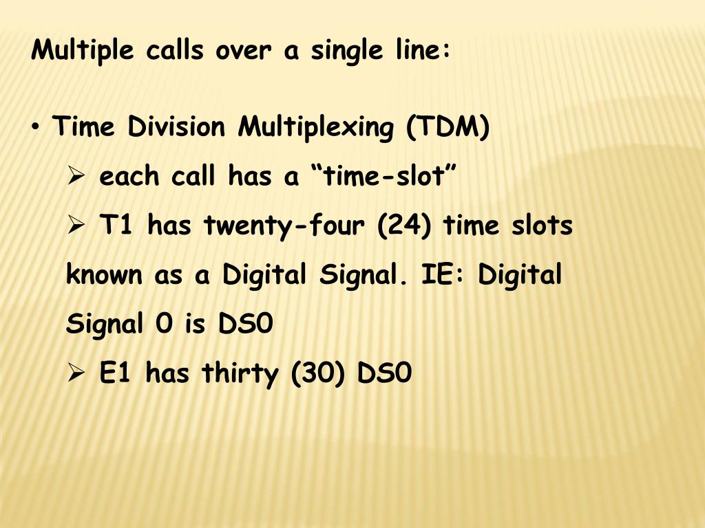 Multiple calls over a single line: • Time Division Multiplexing (TDM) • each call has a “time-slot” • T1 has twenty-four (24) time slots known as a Digital Signal. IE: Digital Signal 0 is DS0 • E1 has thirty (30) DS0