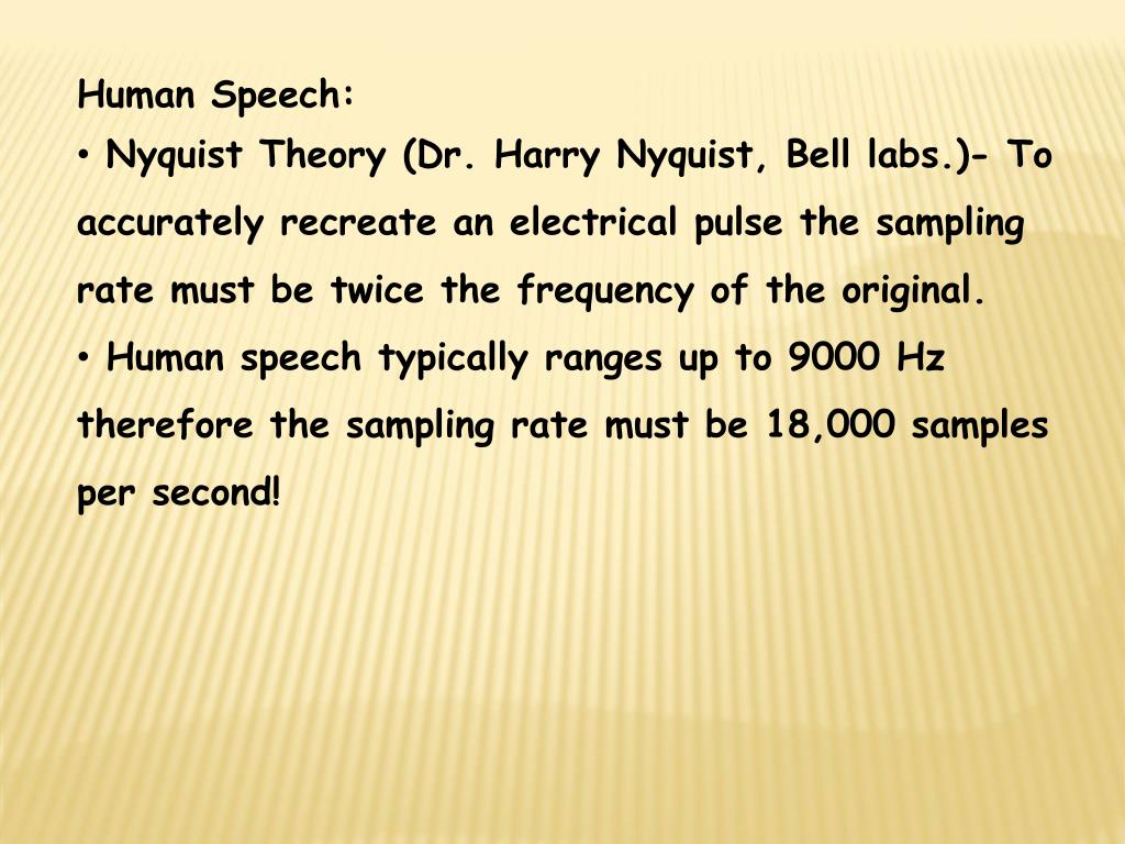 Human Speech: • Nyquist Theory (Dr. Harry Nyquist, Bell labs.)- To accurately recreate an electrical pulse the sampling rate must be twice the frequency of the original. • Human speech typically ranges up to 9000 Hz therefore the sampling rate must be 18,000 samples per second!
