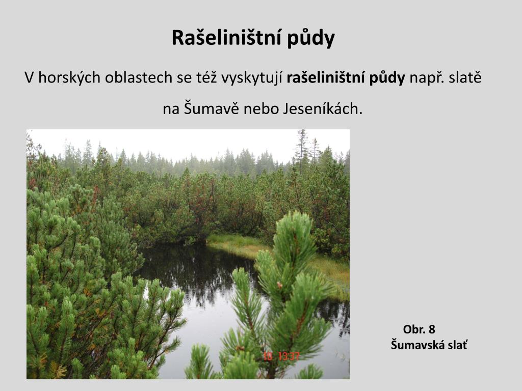 Rašeliništní půdy V horských oblastech se též vyskytují rašeliništní půdy např. slatě na Šumavě nebo Jeseníkách. Obr. 8 Šumavská slať