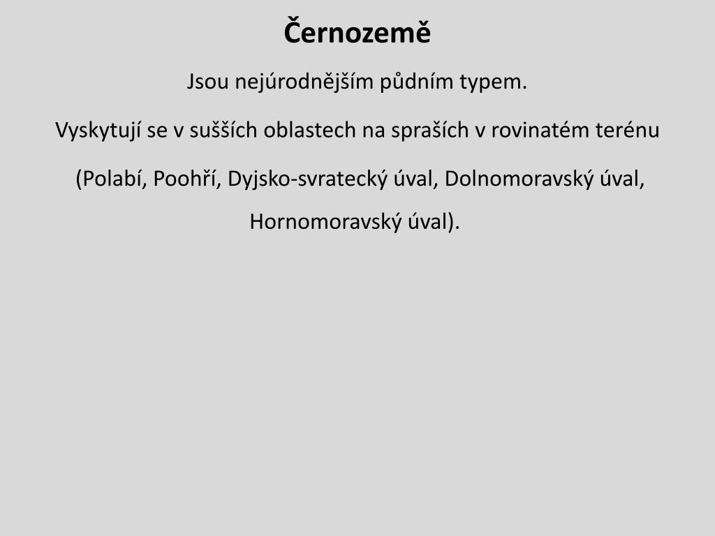Černozemě Jsou nejúrodnějším půdním typem. Vyskytují se v sušších oblastech na spraších v rovinatém terénu (Polabí, Poohří, Dyjsko-svratecký úval, Dolnomoravský úval, Hornomoravský úval).
