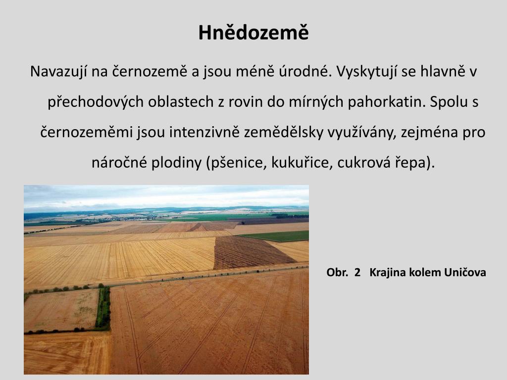 Hnědozemě Navazují na černozemě a jsou méně úrodné. Vyskytují se hlavně v přechodových oblastech z rovin do mírných pahorkatin. Spolu s černozeměmi jsou intenzivně zemědělsky využívány, zejména pro náročné plodiny (pšenice, kukuřice, cukrová řepa). Obr. 2 Krajina kolem Uničova