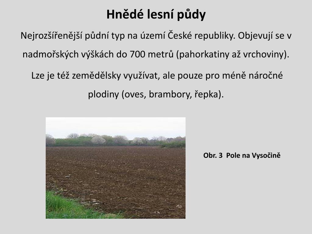 Hnědé lesní půdy Nejrozšířenější půdní typ na území České republiky. Objevují se v nadmořských výškách do 700 metrů (pahorkatiny až vrchoviny). Lze je též zemědělsky využívat, ale pouze pro méně náročné plodiny (oves, brambory, řepka). Obr. 3 Pole na Vysočině