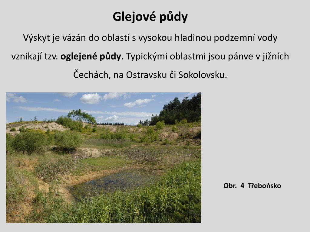 Glejové půdy Výskyt je vázán do oblastí s vysokou hladinou podzemní vody vznikají tzv. oglejené půdy. Typickými oblastmi jsou pánve v jižních Čechách, na Ostravsku či Sokolovsku. Obr. 4 Třeboňsko