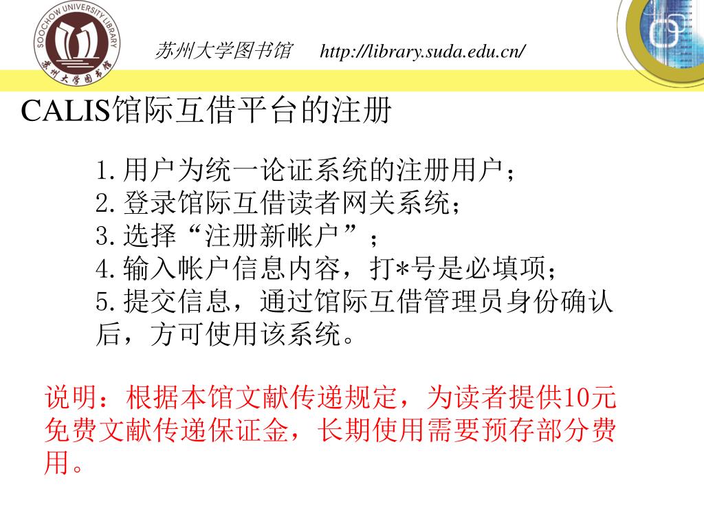 CALIS馆际互借平台的注册 • 1.用户为统一论证系统的注册用户; • 2.登录馆际互借读者网关系统; • 3.选择“注册新帐户”; • 4.输入帐户信息内容,打*号是必填项; • 5.提交信息,通过馆际互借管理员身份确认后,方可使用该系统。 说明:根据本馆文献传递规定,为读者提供10元免费文献传递保证金,长期使用需要预存部分费用。