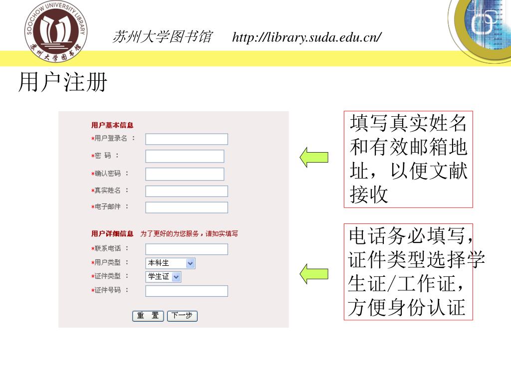 用户注册 填写真实姓名和有效邮箱地址,以便文献接收 电话务必填写,证件类型选择学生证/工作证,方便身份认证