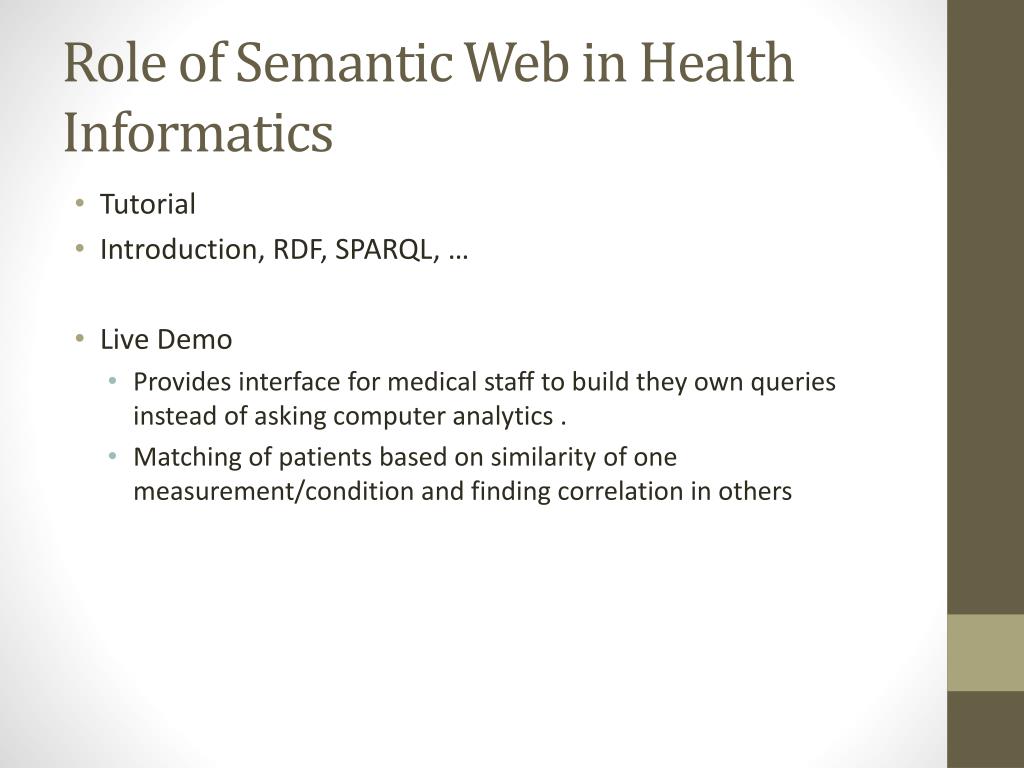 Role of Semantic Web in Health Informatics • Tutorial • Introduction, RDF, SPARQL, … • Live Demo • Provides interface for medical staff to build they own queries instead of asking computer analytics . • Matching of patients based on similarity of one measurement/condition and finding correlation in others