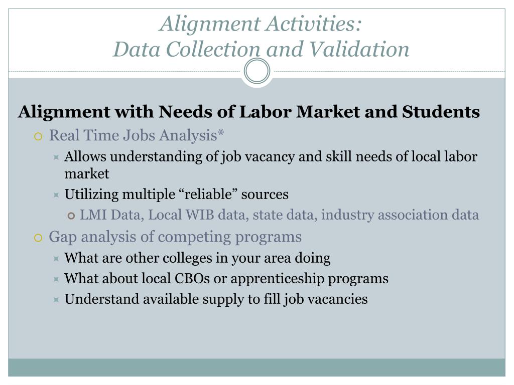 Alignment Activities: Data Collection and Validation Alignment with Needs of Labor Market and Students • Real Time Jobs Analysis* • Allows understanding of job vacancy and skill needs of local labor market • Utilizing multiple “reliable” sources • LMI Data, Local WIB data, state data, industry association data • Gap analysis of competing programs • What are other colleges in your area doing • What about local CBOs or apprenticeship programs • Understand available supply to fill job vacancies