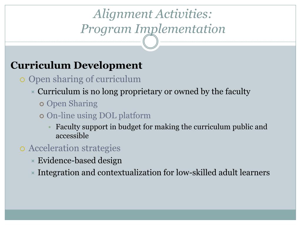 Alignment Activities: Program Implementation Curriculum Development • Open sharing of curriculum • Curriculum is no long proprietary or owned by the faculty • Open Sharing • On-line using DOL platform • Faculty support in budget for making the curriculum public and accessible • Acceleration strategies • Evidence-based design • Integration and contextualization for low-skilled adult learners