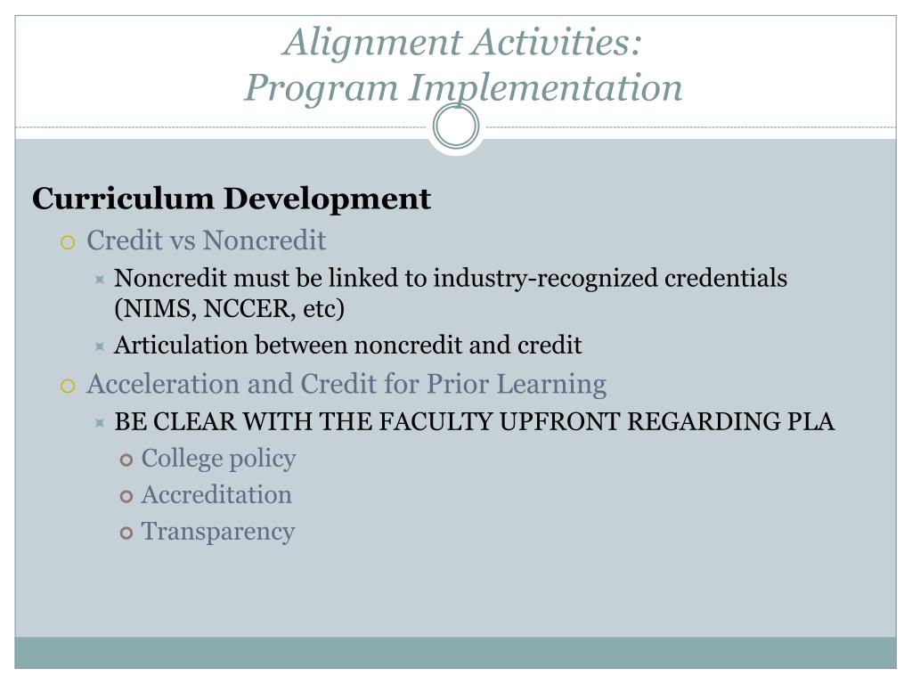 Alignment Activities: Program Implementation Curriculum Development • Credit vs Noncredit • Noncredit must be linked to industry-recognized credentials (NIMS, NCCER, etc) • Articulation between noncredit and credit • Acceleration and Credit for Prior Learning • BE CLEAR WITH THE FACULTY UPFRONT REGARDING PLA • College policy • Accreditation • Transparency