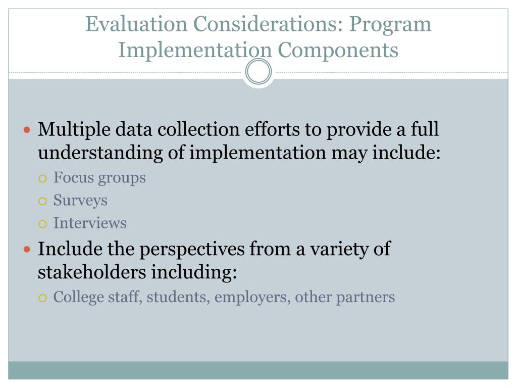 Evaluation Considerations: Program Implementation Components • Multiple data collection efforts to provide a full understanding of implementation may include: • Focus groups • Surveys • Interviews • Include the perspectives from a variety of stakeholders including: • College staff, students, employers, other partners