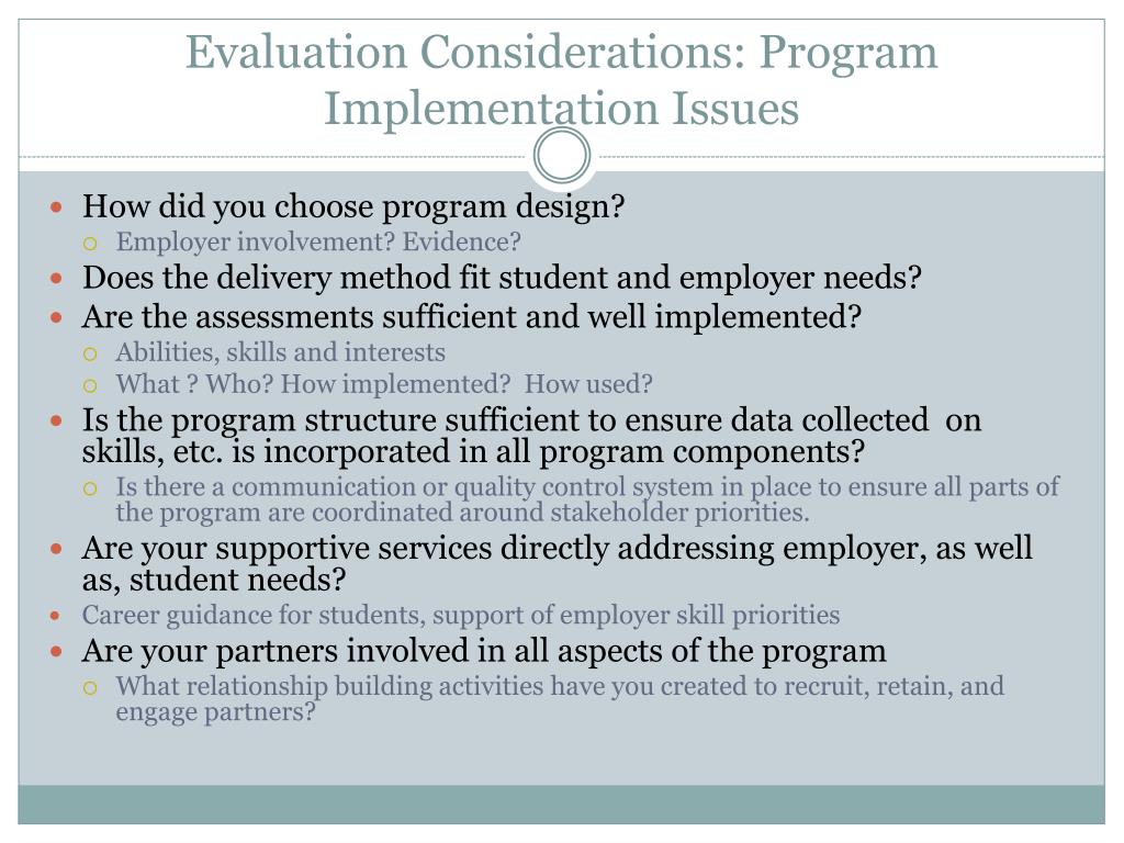 Evaluation Considerations: Program Implementation Issues • How did you choose program design? • Employer involvement? Evidence? • Does the delivery method fit student and employer needs? • Are the assessments sufficient and well implemented? • Abilities, skills and interests • What ? Who? How implemented? How used? • Is the program structure sufficient to ensure data collected on skills, etc. is incorporated in all program components? • Is there a communication or quality control system in place to ensure all parts of the program are coordinated around stakeholder priorities. • Are your supportive services directly addressing employer, as well as, student needs? • Career guidance for students, support of employer skill priorities • Are your partners involved in all aspects of the program • What relationship building activities have you created to recruit, retain, and engage partners?