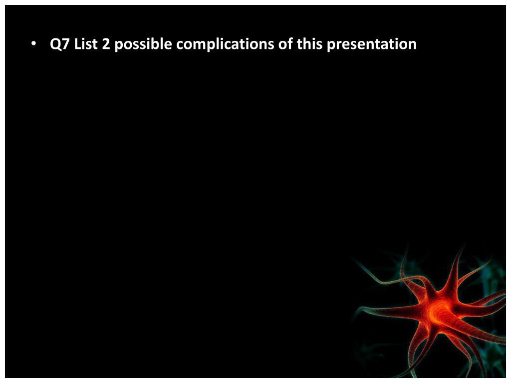 Q6 Discuss general management plan for this patient • Acyclovir (nucleoside analogue, converted to acyclovir monophosphate then to acyclovir triphosphate by virally encoded thymidinekinase, acyclovir triphosphate then inhibits viral DNA polymerase) • Valacyclovir(converted to acyclovir) • Famciclovir (prodrug to penciclovir also converted to triphosphate) • Analgesia for acute neuritis • Routine use of corticosteroid not recommended