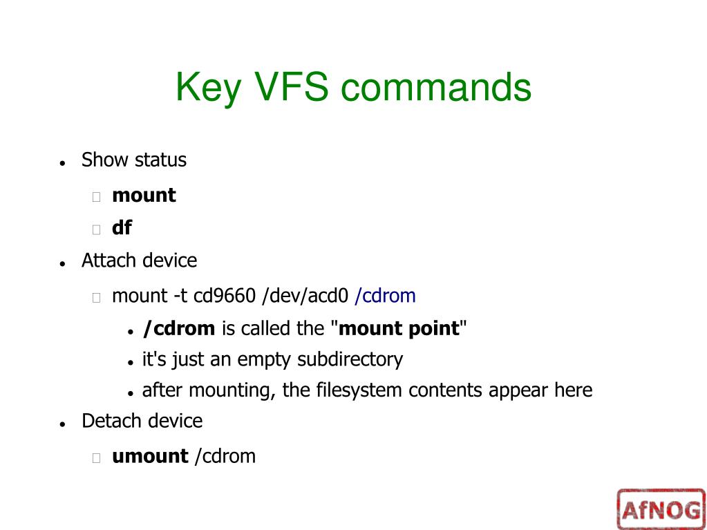 Key VFS commands • Show status • mount • df • Attach device • mount -t cd9660 /dev/acd0 /cdrom • /cdrom is called the "mount point" • it's just an empty subdirectory • after mounting, the filesystem contents appear here • Detach device • umount /cdrom
