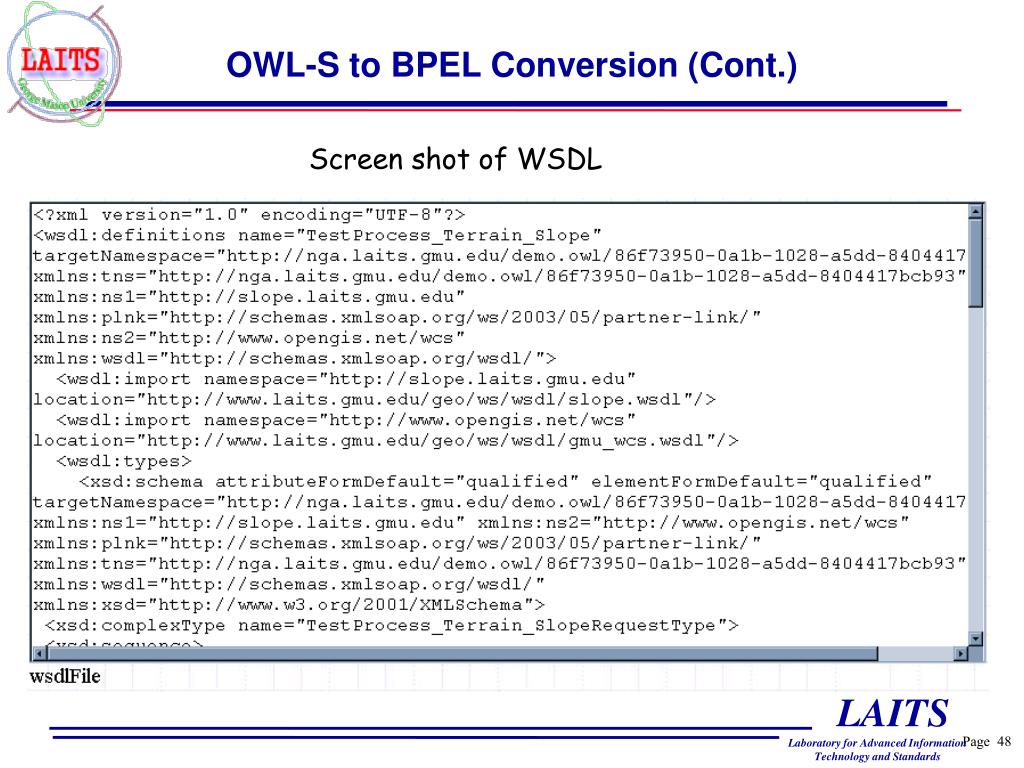 OWL-S to BPEL Conversion (Cont.) Screen shot of WSDL