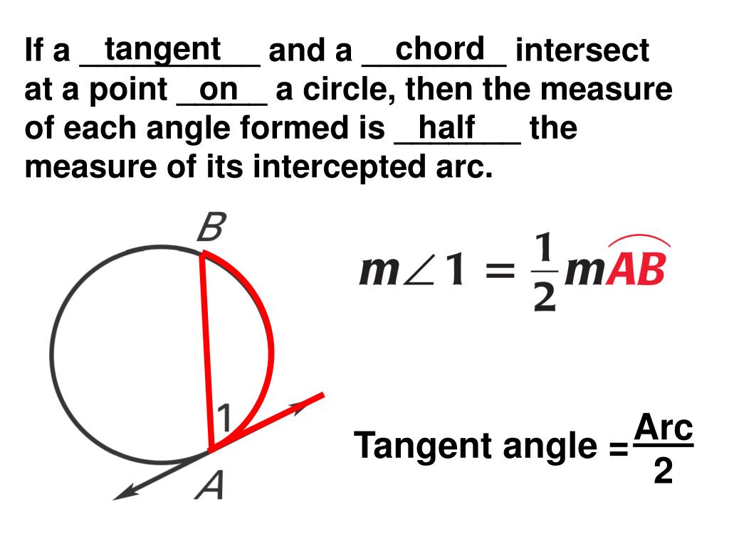 tangent chord If a __________ and a ________ intersect at a point _____ a circle, then the measure of each angle formed is _______ the measure of its intercepted arc. on half Arc 2 Tangent angle =