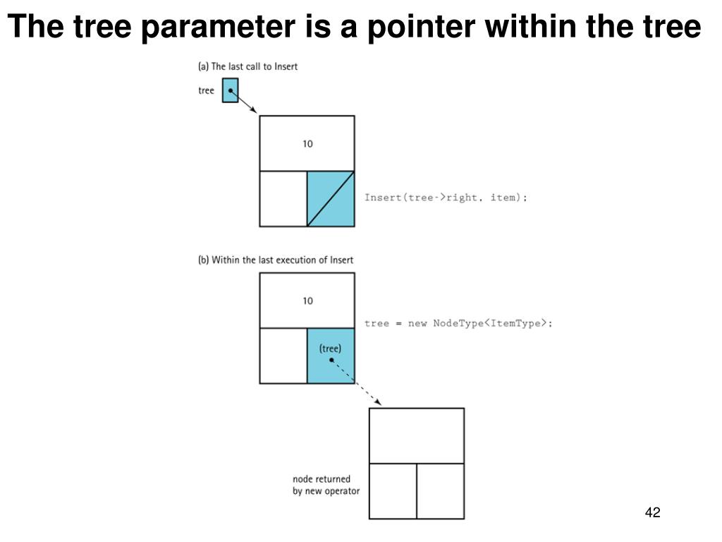 Recursive Insert void Insert(TreeNode*& tree, ItemType item) { if (tree == NULL) {// Insertion place found. tree = new TreeNode; tree->right = NULL; tree->left = NULL; tree->info = item; } else if (item < tree->info) Insert(tree->left, item); else Insert(tree->right, item); }