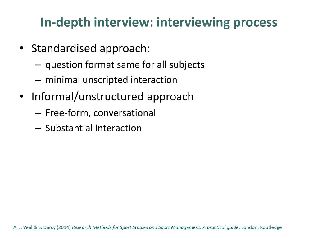 In-depth interview: interviewing process • Standardised approach: • question format same for all subjects • minimal unscripted interaction • Informal/unstructured approach • Free-form, conversational • Substantial interaction A. J. Veal & S. Darcy (2014) Research Methods for Sport Studies and Sport Management: A practical guide. London: Routledge
