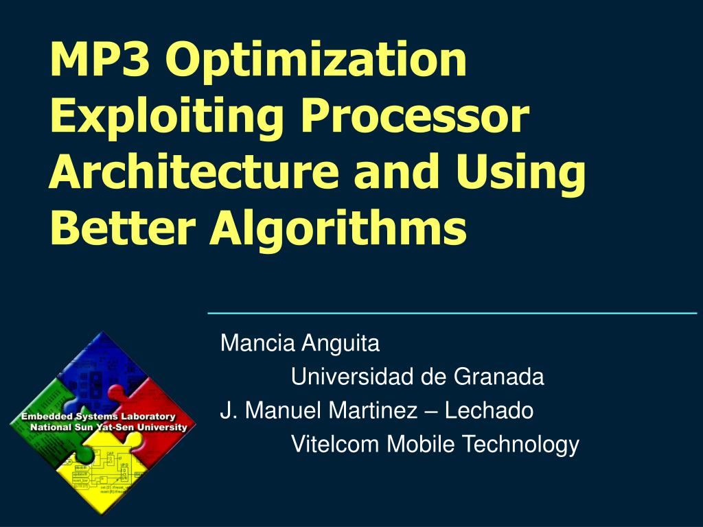 MP3 Optimization Exploiting Processor Architecture and Using Better Algorithms Mancia Anguita Universidad de Granada J. Manuel Martinez – Lechado Vitelcom Mobile Technology