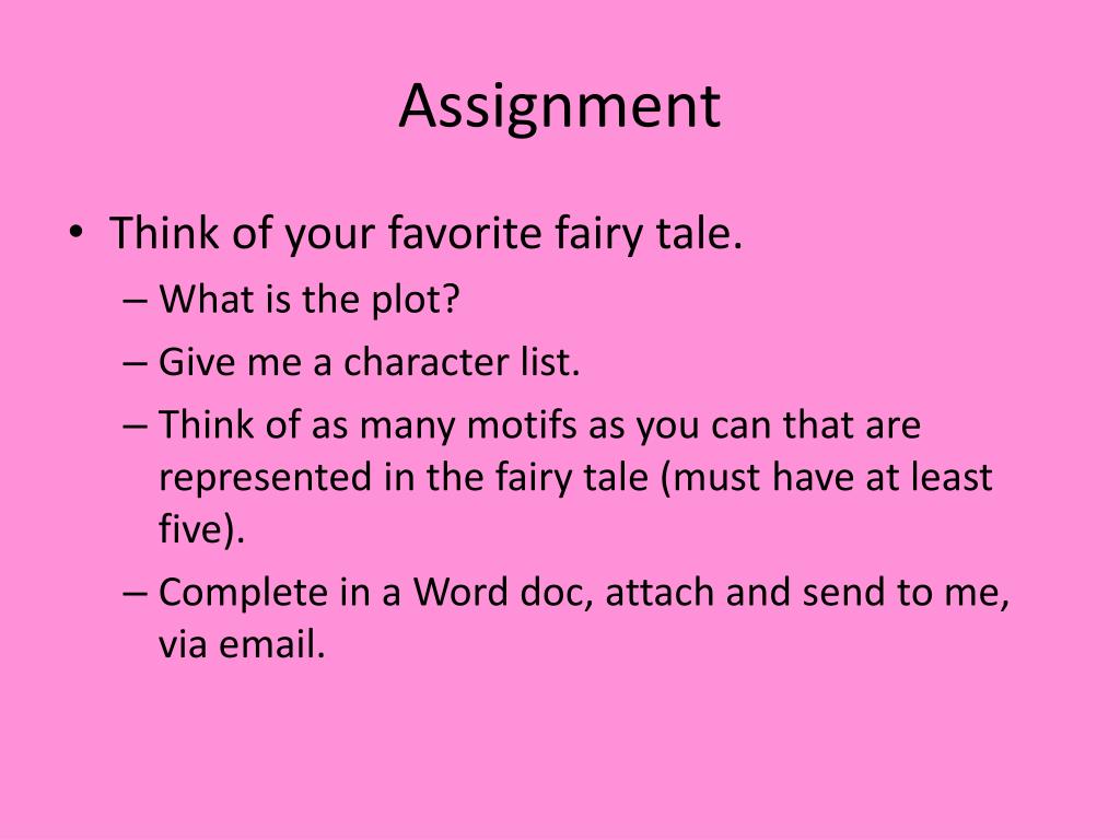Assignment • Think of your favorite fairy tale. • What is the plot? • Give me a character list. • Think of as many motifs as you can that are represented in the fairy tale (must have at least five). • Complete in a Word doc, attach and send to me, via email.