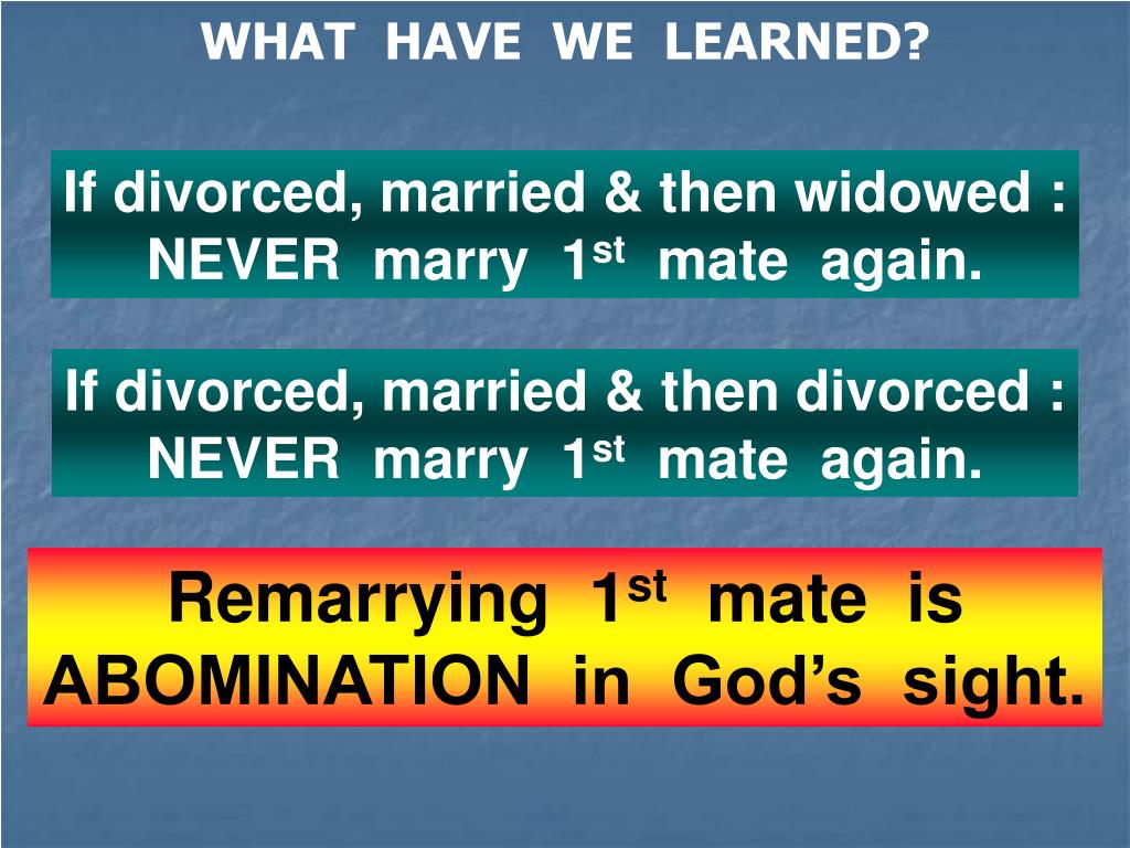 WHAT HAVE WE LEARNED? If divorced, married & then widowed : NEVER marry 1st mate again. If divorced, married & then divorced : NEVER marry 1st mate again. Remarrying 1st mate is ABOMINATION in God’s sight.