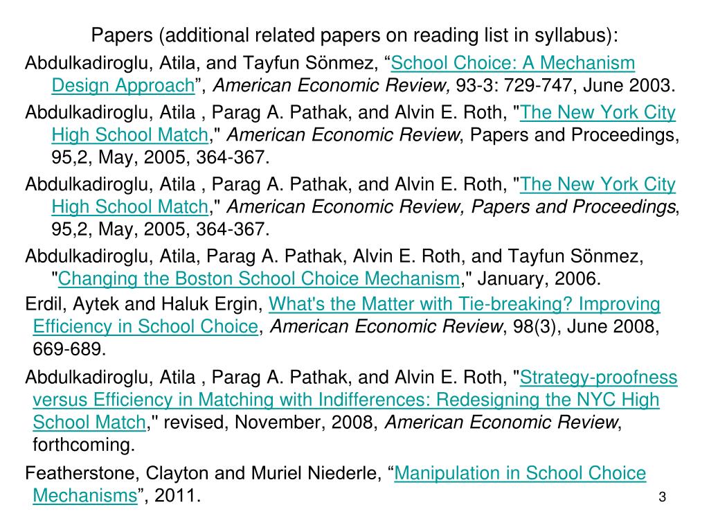 Papers (additional related papers on reading list in syllabus): Abdulkadiroglu, Atila, and Tayfun Sönmez, “School Choice: A Mechanism Design Approach”, American Economic Review, 93-3: 729-747, June 2003. Abdulkadiroglu, Atila , Parag A. Pathak, and Alvin E. Roth, "The New York City High School Match," American Economic Review, Papers and Proceedings, 95,2, May, 2005, 364-367. Abdulkadiroglu, Atila , Parag A. Pathak, and Alvin E. Roth, "The New York City High School Match," American Economic Review, Papers and Proceedings, 95,2, May, 2005, 364-367. Abdulkadiroglu, Atila, Parag A. Pathak, Alvin E. Roth, and Tayfun Sönmez, "Changing the Boston School Choice Mechanism," January, 2006. Erdil, Aytek and Haluk Ergin, What's the Matter with Tie-breaking? Improving Efficiency in School Choice, American Economic Review, 98(3), June 2008, 669-689. Abdulkadiroglu, Atila , Parag A. Pathak, and Alvin E. Roth, "Strategy-proofness versus Efficiency in Matching with Indifferences: Redesigning the NYC High School Match,'' revised, November, 2008, American Economic Review, forthcoming. Featherstone, Clayton and Muriel Niederle, “Manipulation in School Choice Mechanisms”, 2011.