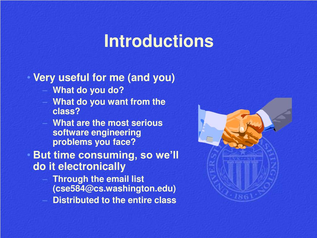Introductions • Very useful for me (and you) • What do you do? • What do you want from the class? • What are the most serious software engineering problems you face? • But time consuming, so we’ll do it electronically • Through the email list (cse584@cs.washington.edu) • Distributed to the entire class