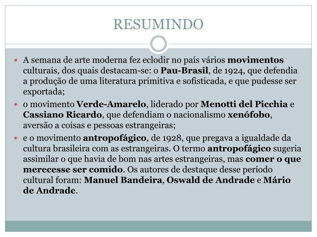 RESUMINDO • A semana de arte moderna fez eclodir no país vários movimentos culturais, dos quais destacam-se: o Pau-Brasil, de 1924, que defendia a produção de uma literatura primitiva e sofisticada, e que pudesse ser exportada; • o movimento Verde-Amarelo, liderado por Menotti del Picchia e Cassiano Ricardo, que defendiam o nacionalismo xenófobo, aversão a coisas e pessoas estrangeiras; • e o movimento antropofágico, de 1928, que pregava a igualdade da cultura brasileira com as estrangeiras. O termo antropofágico sugeria assimilar o que havia de bom nas artes estrangeiras, mas comer o que merecesse ser comido. Os autores de destaque desse período cultural foram: Manuel Bandeira, Oswald de Andrade e Mário de Andrade.
