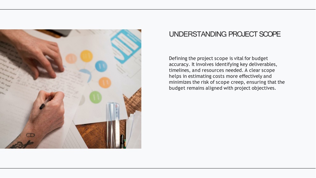 UNDERSTANDINGPROJECTSCOPE Definingtheprojectscopeisvitalforbudget accuracy.Itinvolvesidentifyingkeydeliverables, timelines,andresourcesneeded.Aclearscope helpsinestimatingcostsmoreeffectivelyand minimizestheriskofscopecreep,ensuringthatthe budgetremainsalignedwithprojectobjectives.