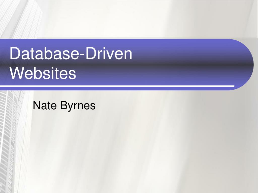Database-Driven Websites. Nate Byrnes. Agenda. Definitions Why Use a Web Database Designing a Database Understanding Web Database Technology Comparing the Tools Databases with Web Capabilities HTML Editors with DB Capabilities Web DB Application Servers