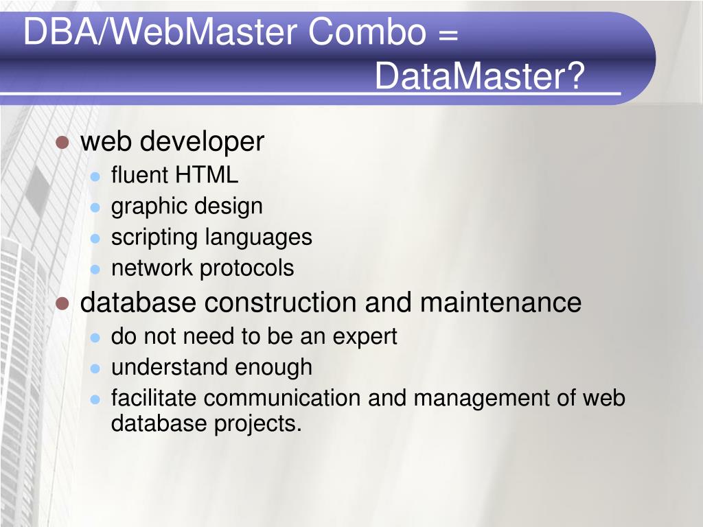 DBA/WebMaster Combo = DataMaster? • web developer • fluent HTML • graphic design • scripting languages • network protocols • database construction and maintenance • do not need to be an expert • understand enough • facilitate communication and management of web database projects.