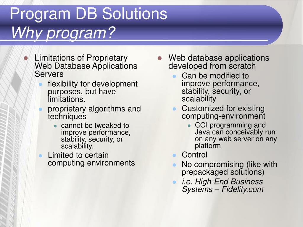 Program DB SolutionsWhy NOT to program? • Time • Cost • Complexity • Short Web-Technology Life-cycle • If it’s not broke, don’t fix it