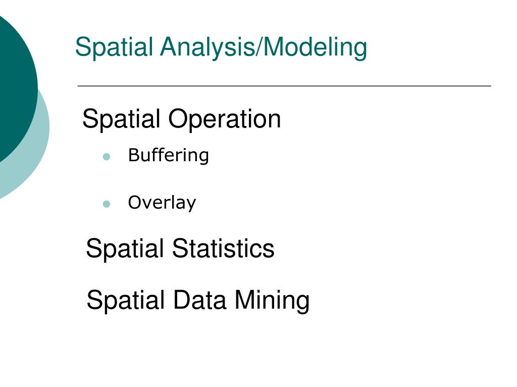 Spatial Analysis/Modeling Spatial Operation • Buffering • Overlay Spatial Statistics Spatial Data Mining