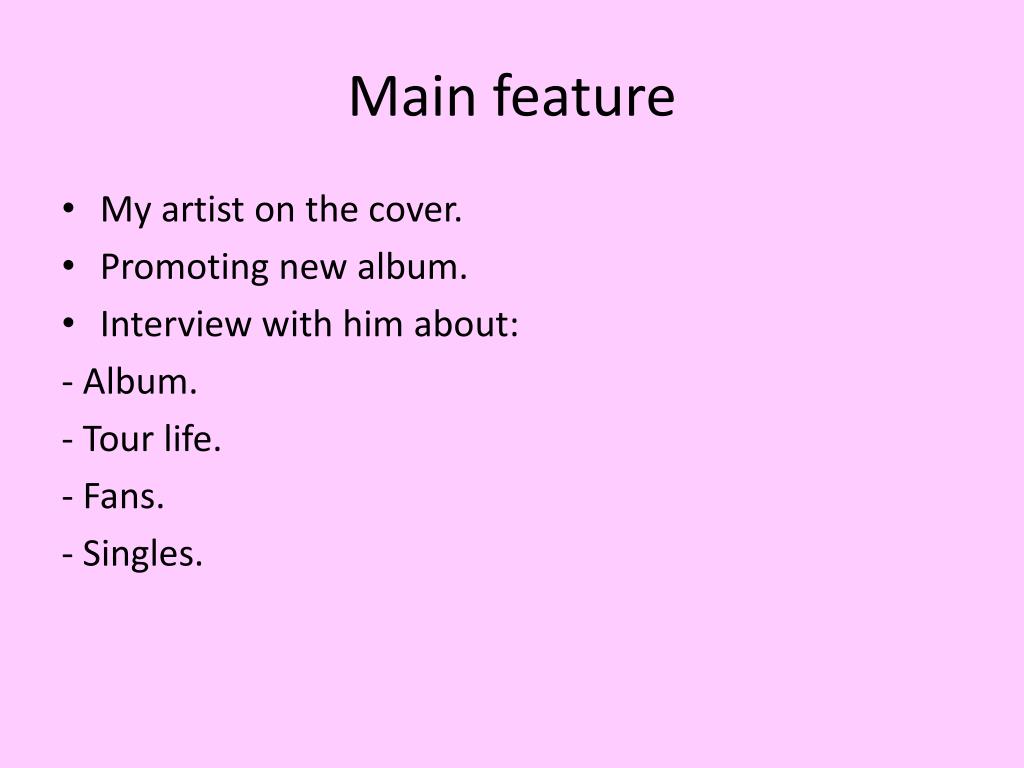 Main feature • My artist on the cover. • Promoting new album. • Interview with him about: - Album. - Tour life. - Fans. - Singles.