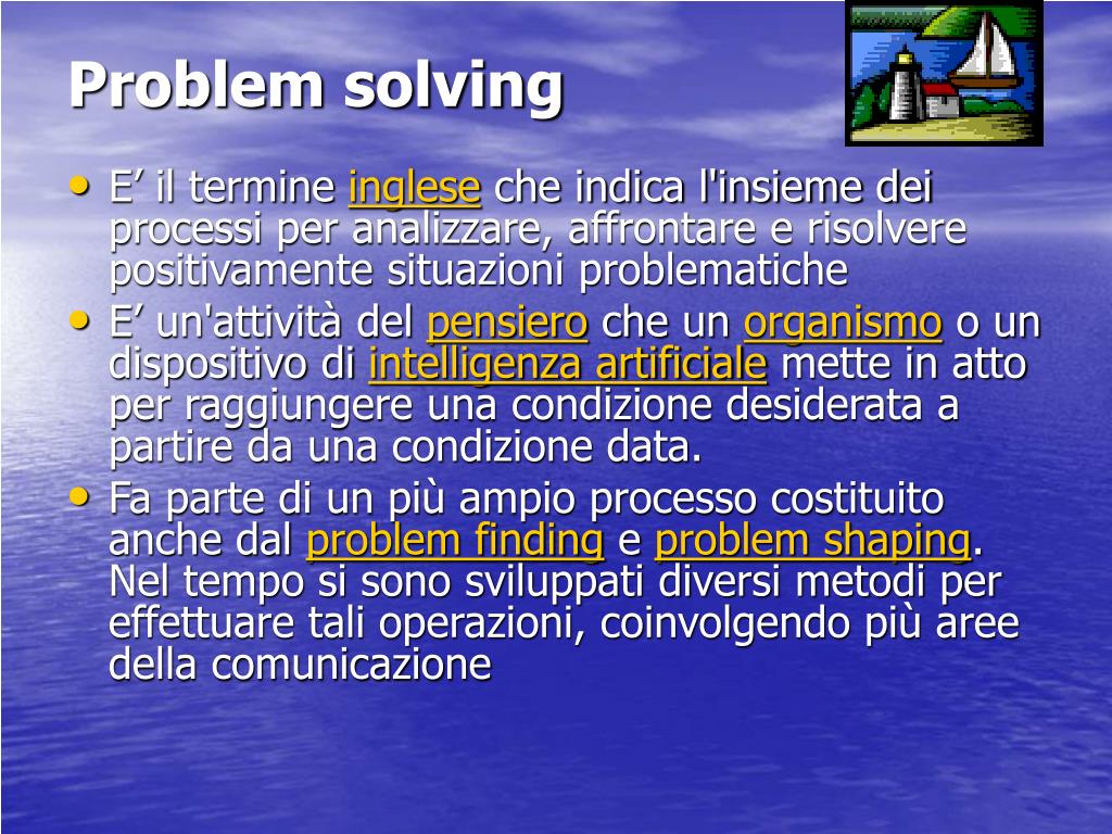 Problem solving • E’ il termine inglese che indica l'insieme dei processi per analizzare, affrontare e risolvere positivamente situazioni problematiche • E’ un'attività del pensiero che un organismo o un dispositivo di intelligenza artificiale mette in atto per raggiungere una condizione desiderata a partire da una condizione data. • Fa parte di un più ampio processo costituito anche dal problem finding e problem shaping. Nel tempo si sono sviluppati diversi metodi per effettuare tali operazioni, coinvolgendo più aree della comunicazione