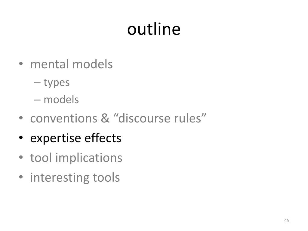outline • mental models • types • models • conventions & “discourse rules” • expertise effects • tool implications • interesting tools