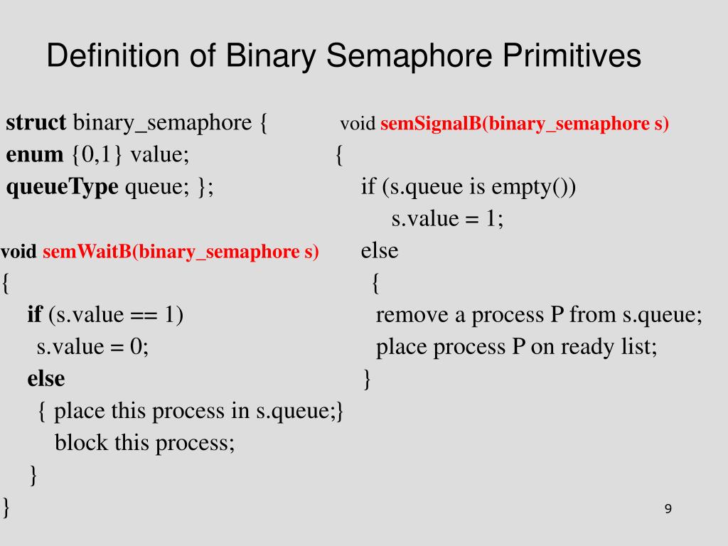 struct binary_semaphore { enum {0,1} value; queueType queue; }; voidsemWaitB(binary_semaphore s) { if (s.value == 1) s.value = 0; else { place this process in s.queue; block this process; } } void semSignalB(binary_semaphore s) { if (s.queue is empty()) s.value = 1; else { remove a process P from s.queue; place process P on ready list; } } Definition of Binary Semaphore Primitives