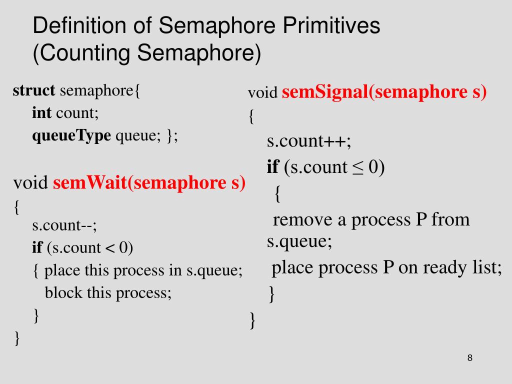 struct semaphore{ int count; queueType queue; }; void semWait(semaphore s) {s.count--; if (s.count < 0) { place this process in s.queue; block this process; } } void semSignal(semaphore s) { s.count++; if (s.count ≤ 0) { remove a process P from s.queue; place process P on ready list; } } Definition of Semaphore Primitives (Counting Semaphore)