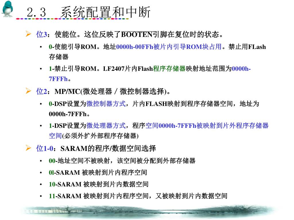 2.3 系统配置和中断 • 位3:使能位。这位反映了BOOTEN引脚在复位时的状态。 • 0-使能引导ROM。地址0000h-00FFh被片内引导ROM块占用。禁止用FLash存储器 • 1-禁止引导ROM。LF2407片内Flash程序存储器映射地址范围为0000h-7FFFh。 • 位2:MP/MC(微处理器/微控制器选择)。 • 0-DSP设置为微控制器方式,片内FLASH映射到程序存储器空间,地址为0000h-7FFFh。 • 1-DSP设置为微处理器方式,程序空间0000h-7FFFh被映射到片外程序存储器空间(必须外扩外部程序存储器) • 位1-0:SARAM的程序/数据空间选择 • 00-地址空间不被映射,该空间被分配到外部存储器 • 0l-SARAM 被映射到片内程序空间 • 10-SARAM 被映射到片内数据空间 • 11-SARAM 被映射到片内程序空间,又被映射到片内数据空间
