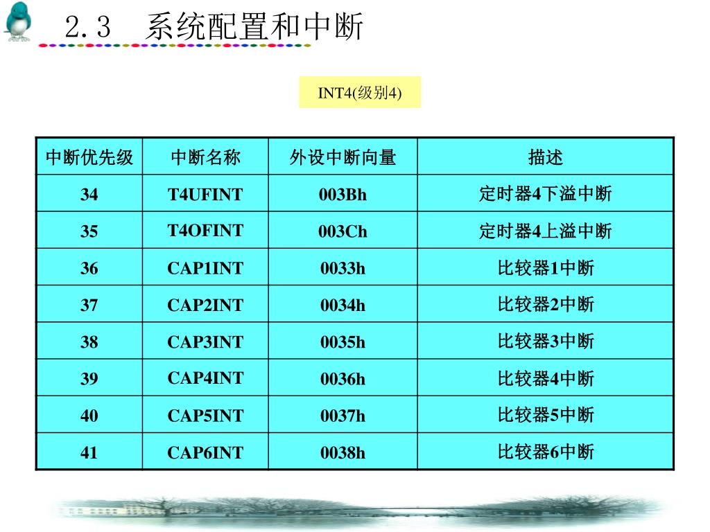 2.3 系统配置和中断 可屏蔽中断源的优先级和中断入口地址向量表 INT1(级别1)