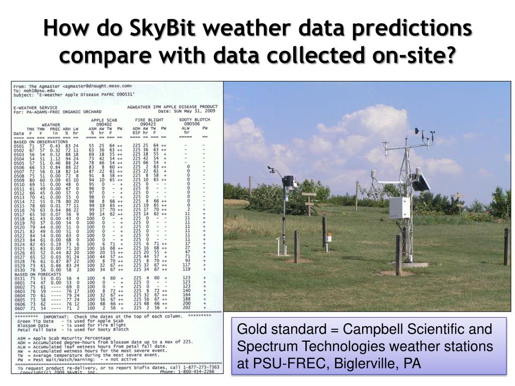 How do SkyBit weather data predictions compare with data collected on-site? Gold standard = Campbell Scientific and Spectrum Technologies weather stations at PSU-FREC, Biglerville, PA