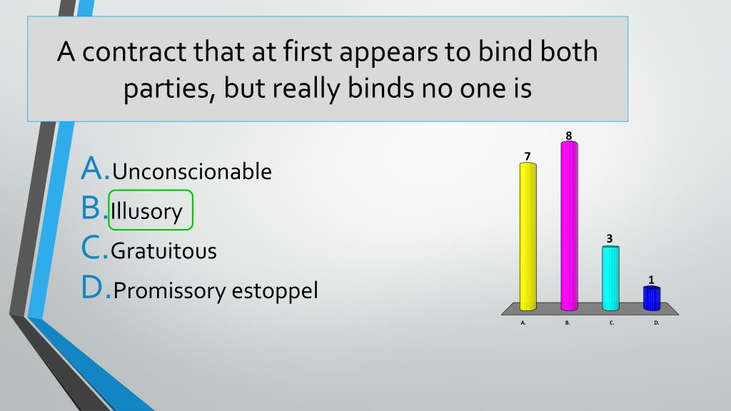 A contract that at first appears to bind both parties, but really binds no one is • Unconscionable • Illusory • Gratuitous • Promissory estoppel
