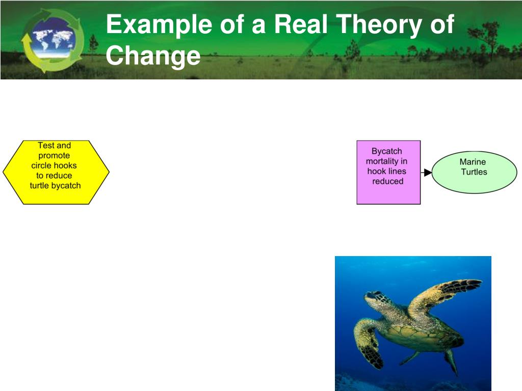 Example of a Real Theory of Change Measurable Goal: By 2025, there will be a 10% increase in the survival of leatherback and green turtles into the GoC compared to 2005 levels. Indicator: Abundance Index Method: Counting of nesting turtles Date: Every three years, starting in 2007 Responsible Entity: Turtle camps personnel Place: Baja California Sur and Michoacán turtle camps