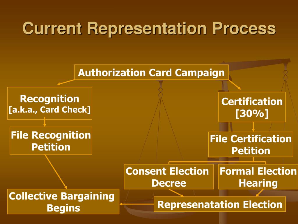 Current Representation Process Authorization Card Campaign Recognition [a.k.a., Card Check] Certification [30%] File Recognition Petition File Certification Petition Consent Election Decree Formal Election Hearing Collective Bargaining Begins Represenatation Election