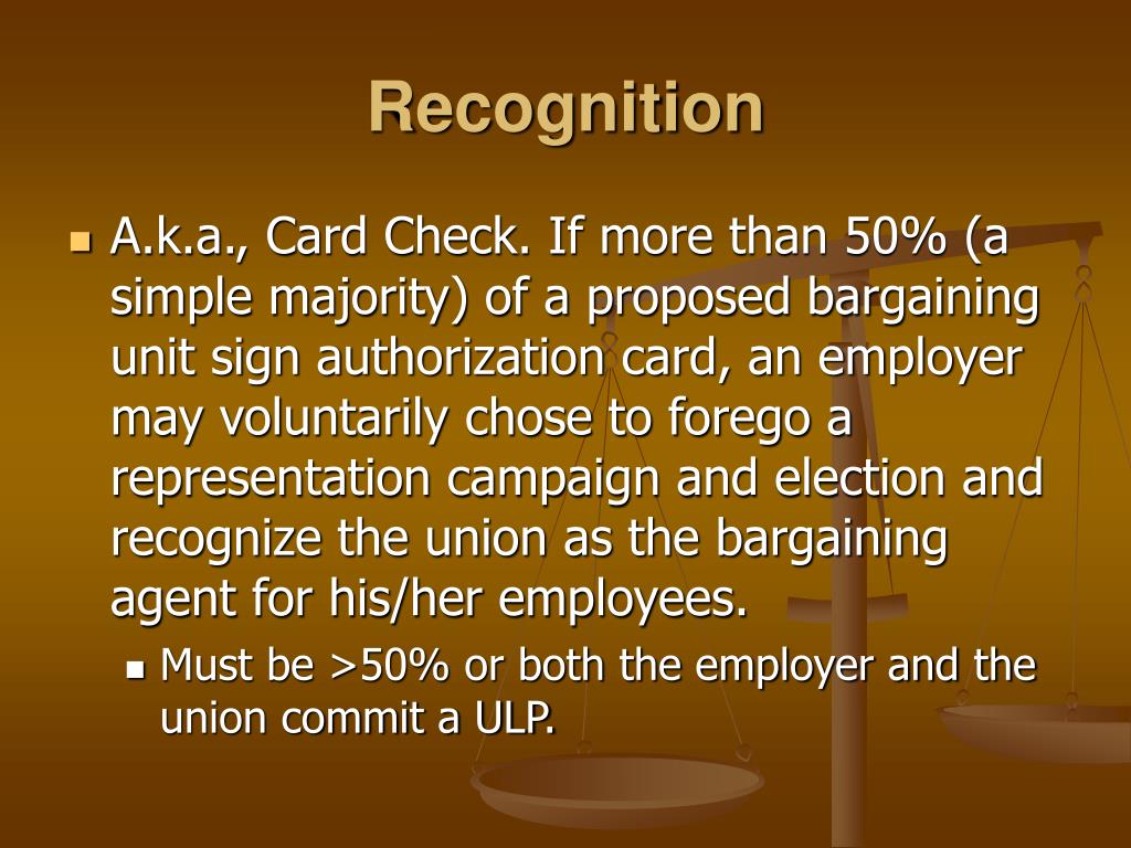 Recognition • A.k.a., Card Check. If more than 50% (a simple majority) of a proposed bargaining unit sign authorization card, an employer may voluntarily chose to forego a representation campaign and election and recognize the union as the bargaining agent for his/her employees. • Must be >50% or both the employer and the union commit a ULP.