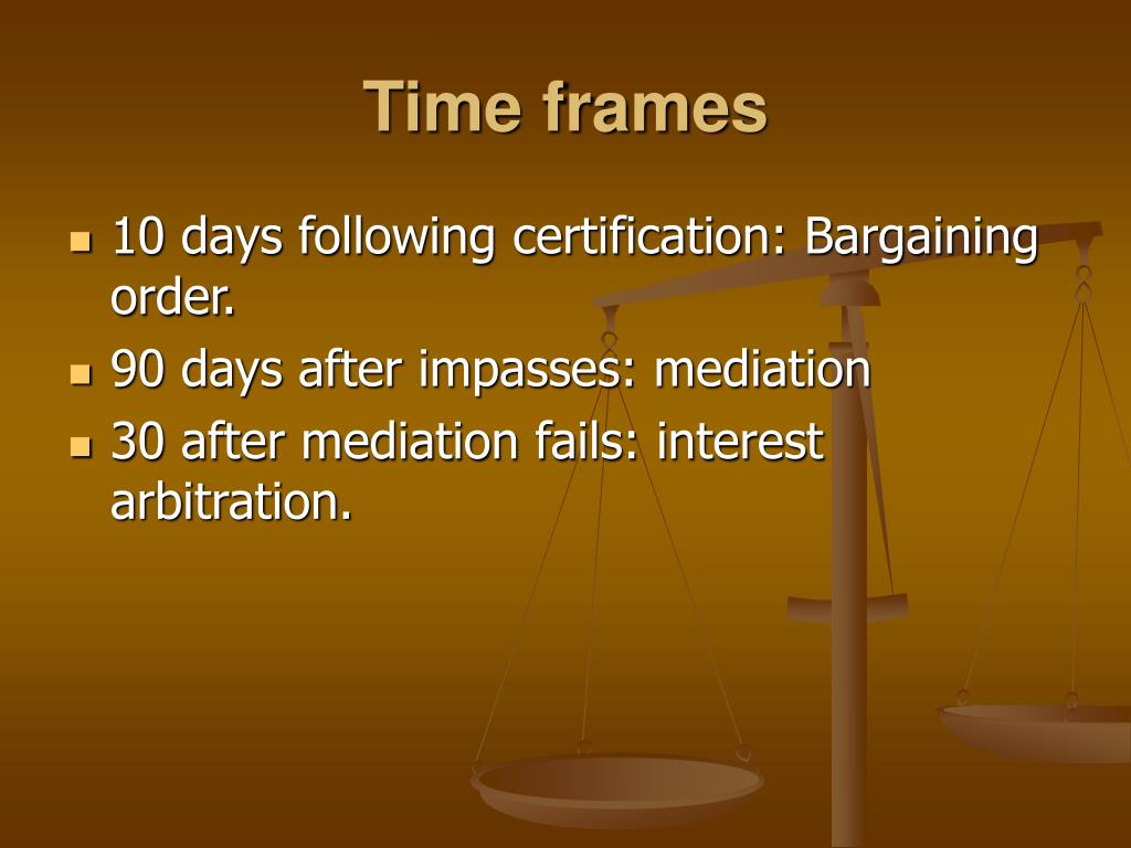 Time frames • 10 days following certification: Bargaining order. • 90 days after impasses: mediation • 30 after mediation fails: interest arbitration.