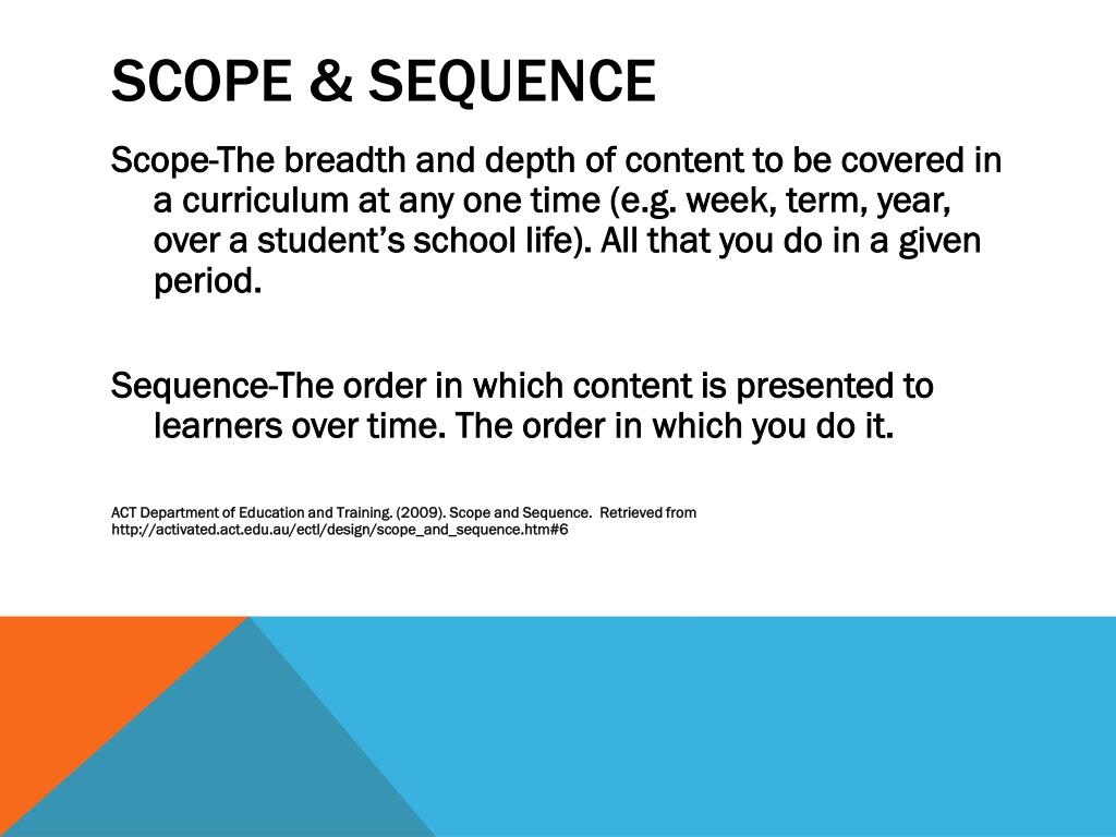 Scope & Sequence • Scope-The breadth and depth of content to be covered in a curriculum at any one time (e.g. week, term, year, over a student’s school life). All that you do in a given period. • Sequence-The order in which content is presented to learners over time. The order in which you do it. ACT Department of Education and Training. (2009). Scope and Sequence. Retrieved from http://activated.act.edu.au/ectl/design/scope_and_sequence.htm#6
