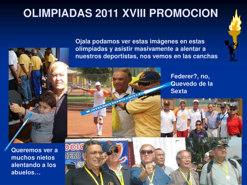 OLIMPIADAS 2011 XVIII PROMOCION Ojala podamos ver estas imágenes en estas olimpiadas y asistir masivamente a alentar a nuestros deportistas, nos vemos en las canchas Federer?, no, Quevedo de la Sexta Queremos ver a muchos nietos alentando a los abuelos…