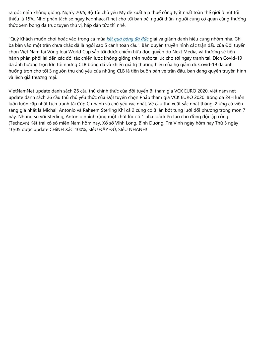 ra góc nhìn không giống. Ngày 20/5, Bộ Tài chủ yếu Mỹ đề xuất áp thuế công ty ít nhất toàn thế giới ở nút tối thiểu là 15%. Nhớ phân tách sẻ ngay keonhacai1.net cho tới bạn bè, người thân, người cùng cơ quan cùng thưởng thức xem bong da truc tuyen thú vị, hấp dẫn tức thì nhé. "Quý Khách muốn chơi hoặc vào trong cả mùa kết quả bóng đá đức giải và giành danh hiệu cùng nhóm nhà. Ghi ba bàn vào một trận chưa chắc đã là ngôi sao 5 cánh toàn cầu". Bản quyền truyền hình các trận đấu của ĐộI tuyển chọn Việt Nam tại Vòng loại World Cup sắp tới được chiếm hữu độc quyền do Next Media, và thường sẽ tiến hành phân phối lại đến các đối tác chiến lược không giống trên nước ta lúc cho tới ngày tranh tài. Dịch Covid-19 đã ảnh hưởng trọn lớn tới những CLB bóng đá và khiến giá trị thương hiệu của họ giảm đi. Covid-19 đã ảnh hưởng trọn cho tới 3 nguồn thu chủ yếu của những CLB là tiền buôn bán vé trận đấu, bạn dạng quyền truyền hình và lệch giá thương mại. VietNamNet update danh sách 26 cầu thủ chính thức của đội tuyển Bỉ tham gia VCK EURO 2020. việt nam net update danh sách 26 cầu thủ chủ yếu thức của ĐộI tuyển chọn Pháp tham gia VCK EURO 2020. Bóng đá 24H luôn luôn luôn cập nhật Lịch tranh tài Cúp C nhanh và chủ yếu xác nhất. Về cầu thủ xuất sắc nhất tháng, 2 ứng cử viên sáng giá nhất là Michail Antonio và Raheem Sterling Khi cả 2 cùng có 8 lần bớt tung lưới đối phương trong mon 7 này. Nhưng so với Sterling, Antonio nhỉnh rộng một chút lúc có 1 pha loài kiến tạo cho đồng đội lập công. (Techz.vn) Kết trái xổ số miền Nam hôm nay, Xổ số Vĩnh Long, Bình Dương, Trà Vinh ngày hôm nay Thứ 5 ngày 10/05 được update CHíNH XáC 100%, SIêU ĐẦY ĐỦ, SIêU NHANH!