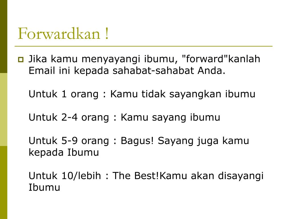 Forwardkan ! • Jika kamu menyayangi ibumu, "forward"kanlah Email ini kepada sahabat-sahabat Anda.Untuk 1 orang : Kamu tidak sayangkan ibumuUntuk 2-4 orang : Kamu sayang ibumuUntuk 5-9 orang : Bagus! Sayang juga kamu kepada IbumuUntuk 10/lebih : The Best!Kamu akan disayangi Ibumu