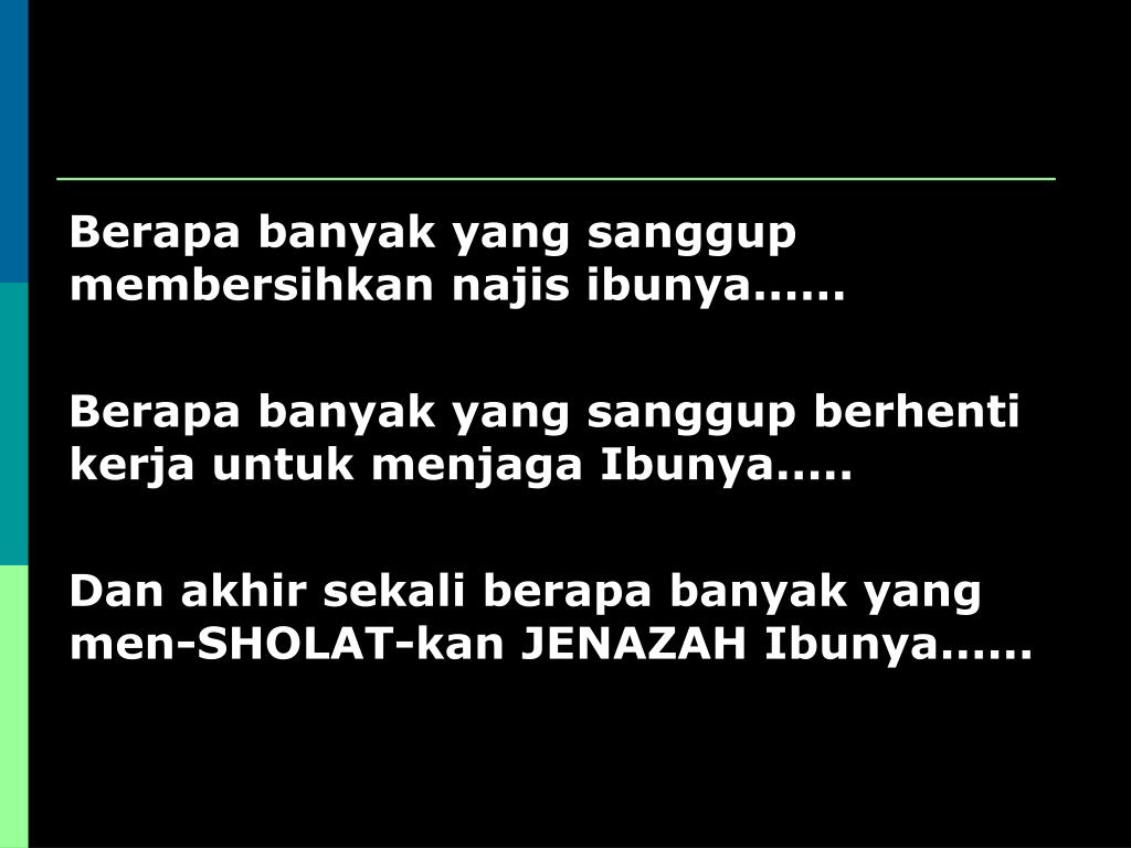 Berapa banyak yang sanggup membersihkan najis ibunya...... Berapa banyak yang sanggup berhenti kerja untuk menjaga Ibunya..... Dan akhir sekali berapa banyak yang men-SHOLAT-kan JENAZAH Ibunya......